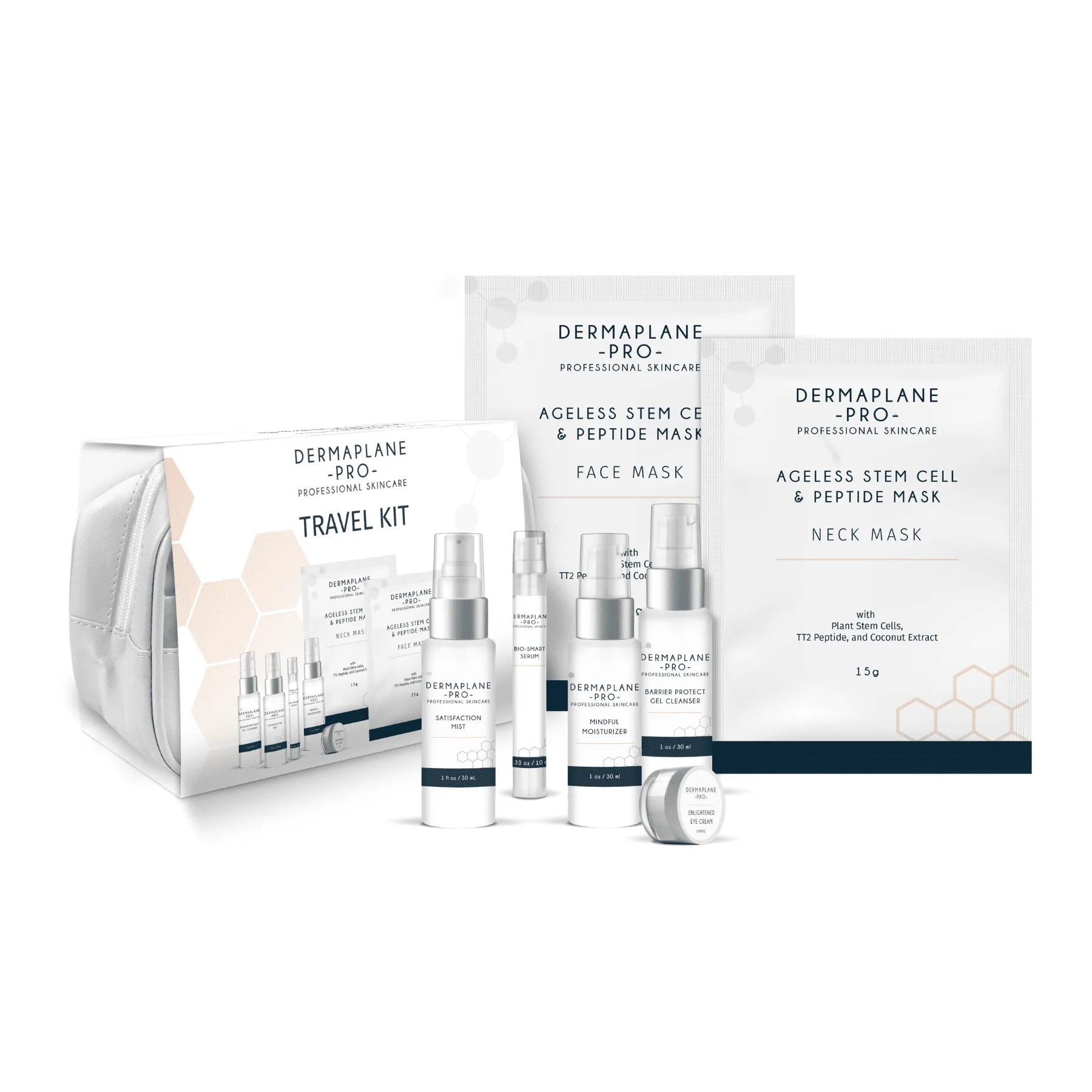 DermaplanePro has brought all of your favorite new skincare products together in a convenient travel kit, complete with a see-through pouch to keep it all organized! Not only does the Professional Skincare Travel Kit contain smaller versions of the skincare line, but it also contains 1 face and 1 neck mask to minimize any stress to your skin from traveling.